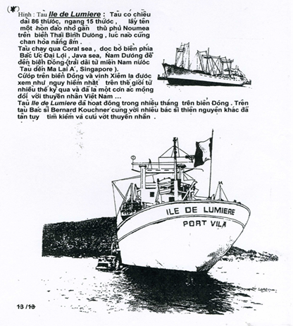 Tôi nhận ra chiếc tàu bệnh viện dài sơn trắng này, tôi đă nh́n thấy sáng sớm 18 tháng tư năm 1979, khi tàu chúng tôi KG 0783 vừa thoát khỏi cướp Thái Lan ngoài biển Đông, chạy tấp vô những quần đảo ngoài khơi Mă Lai để tránh núp. Đó là tàu Lle de Lumière của Pháp do nhóm Bác sĩ không biên giới Bernard Kouchner tổ chức, đang đi t́m vớt thuyền nhân trên biển Đông. Về phía Việt nam, cũng có nhiều đồng nghiệp như Bác sĩ Nguyễn Ngọc Kỳ, Bác sĩ Nguyễn Thượng Vũ, Bác sĩ Đường Thiện Đồng, Bác sĩ Trang Châu cùng vài bác sĩ khác tha thiết với thuyền nhân, đă đóng cửa pḥng mạch để lênh đênh trên biển Đông, t́m kiếm và cứu vớt thuyền nhân trốn chạy Cộng Sản.
